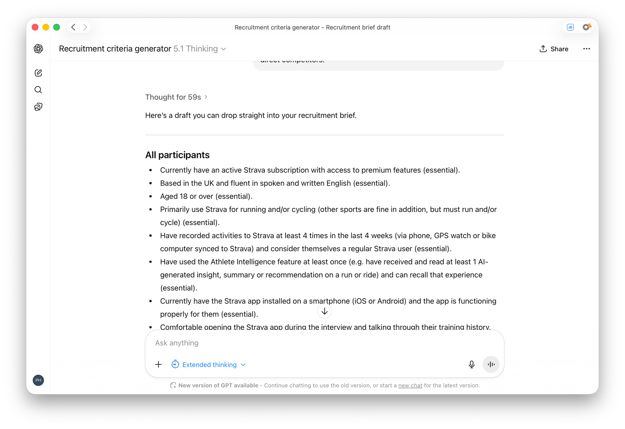 Participants should be English-speaking and based in the UK, using either iOS or Android. We are not limiting by OS version, but the app must be functioning properly for them. We’re not targeting any specific age range or other demographic criteria beyond ensuring they are regular users of the app. We’ll exclude anyone who has taken part in recent UX research for Strava or who works for Strava or its direct competitors.
