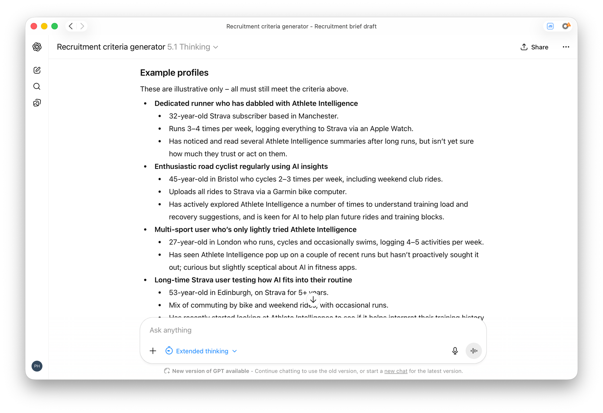 I'm working on the Athlete Intelligence feature in the Strava app – it’s a new AI tool that analyses your workout data and gives you generative AI feedback on your runs and rides. It’s already live, so this is evaluative research, and we’re trying to understand whether people find it valuable, what’s working, what’s not, and what else they might want AI to do in the app.