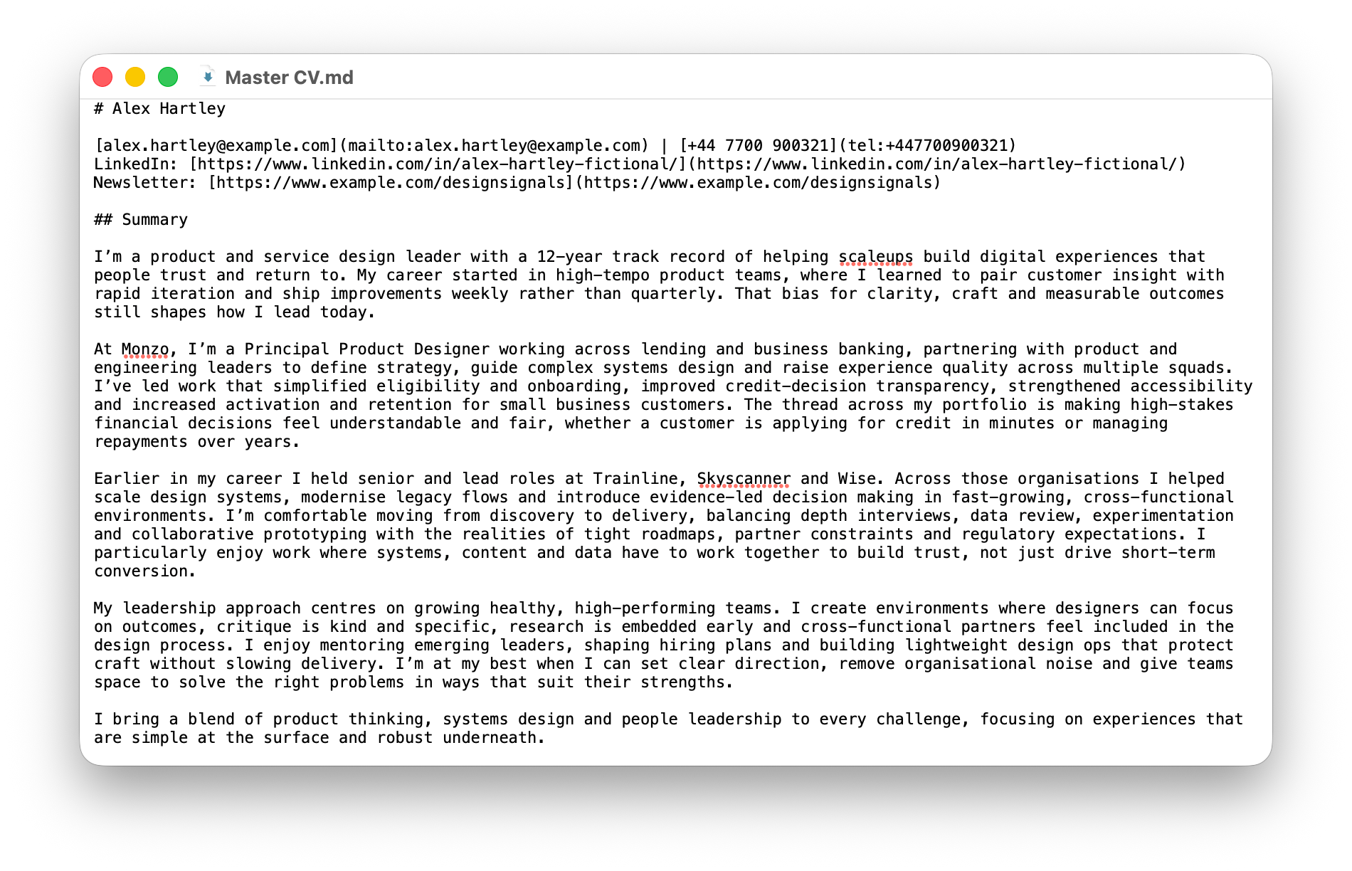 Once you have your master CV Markdown file, you’re ready for the next step.