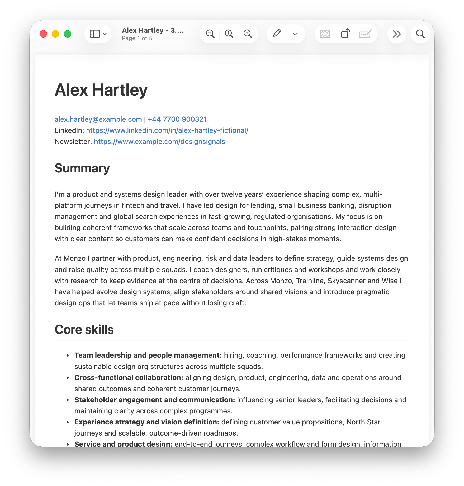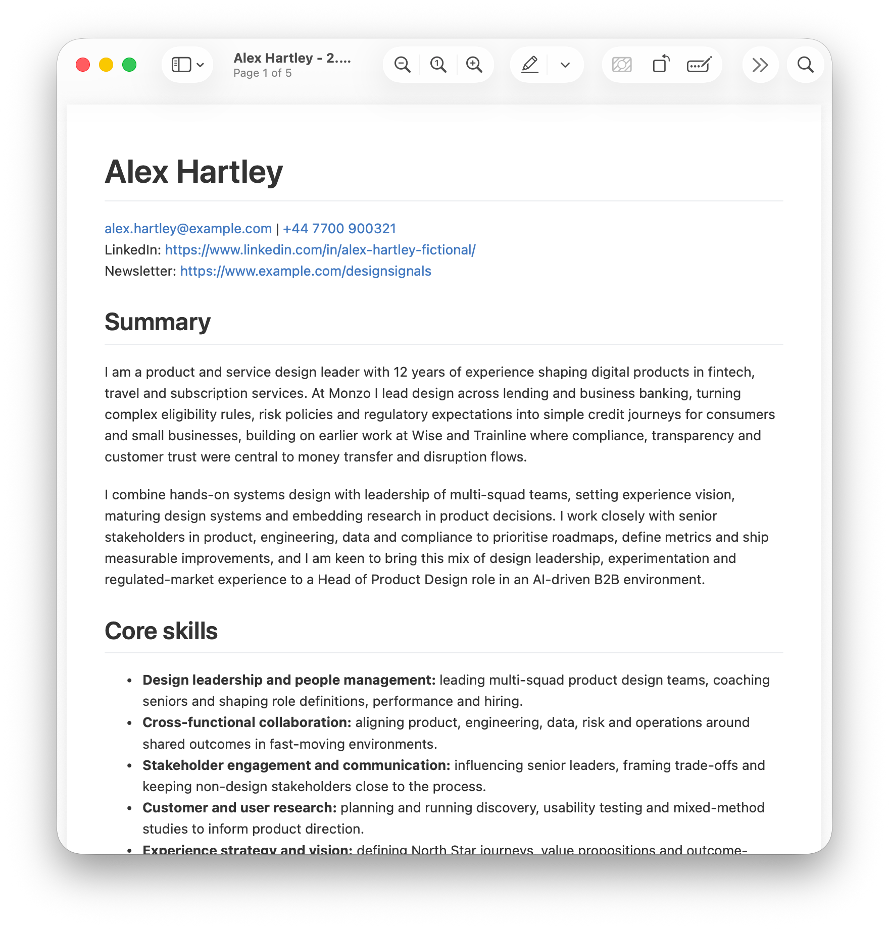 - The Marked 2 app takes the tailored CV (which is in Markdown) and outputs it as a nicely formatted PDF.