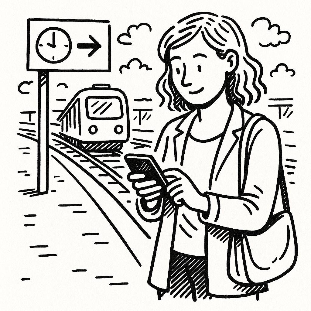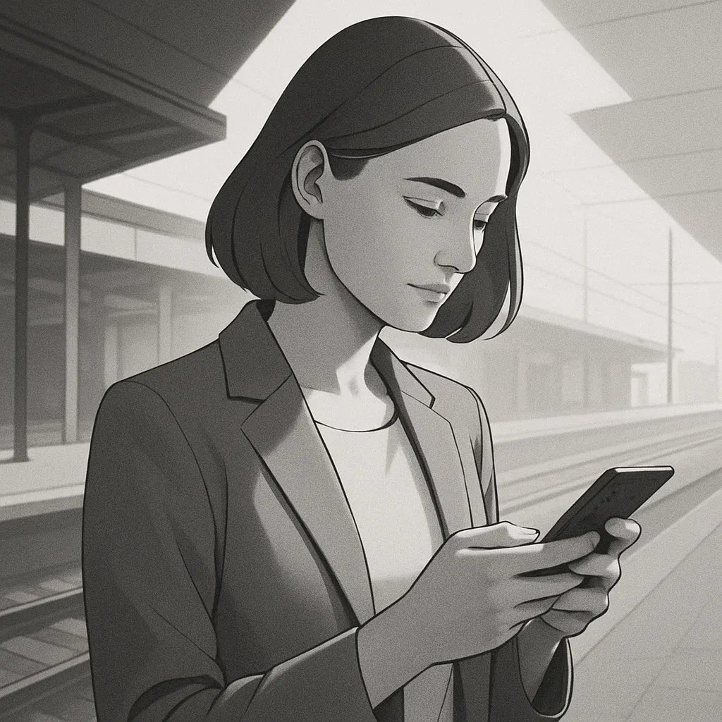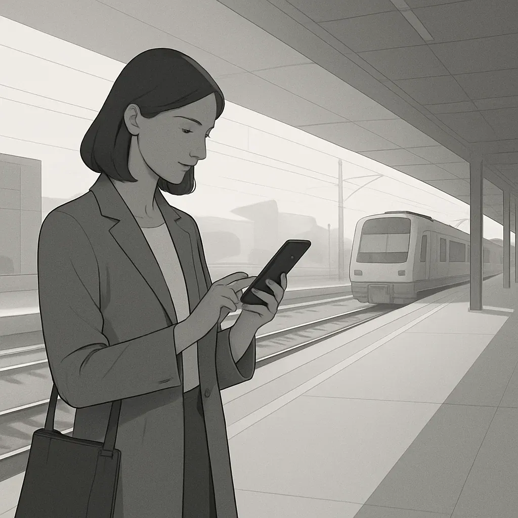 A woman in her mid-30s is standing on a railway station platform, using a smartphone. Wide angle.