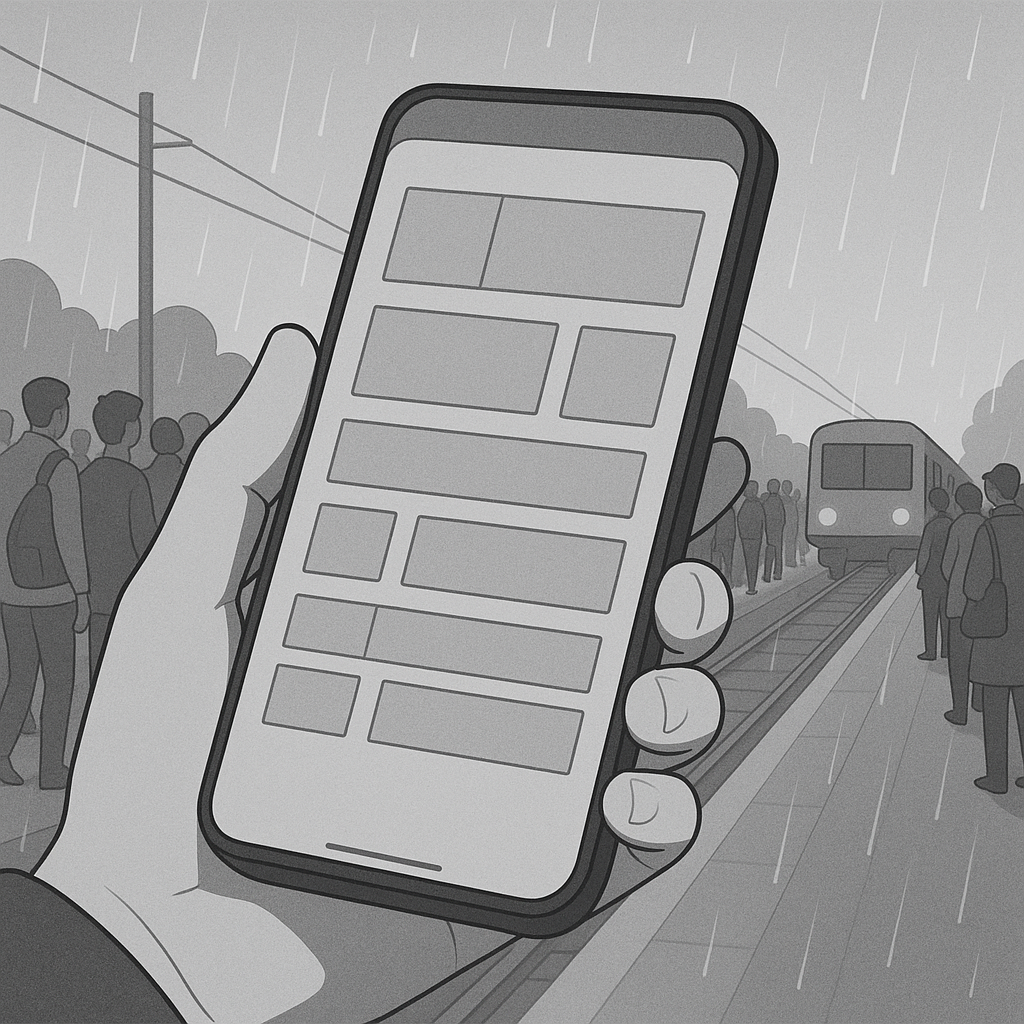 In the background, there is a railway station platform. The platform is very busy as it’s the morning commute rush hour. It is raining and the platform has no roof. We only see one of the user’s hands holding the phone.
