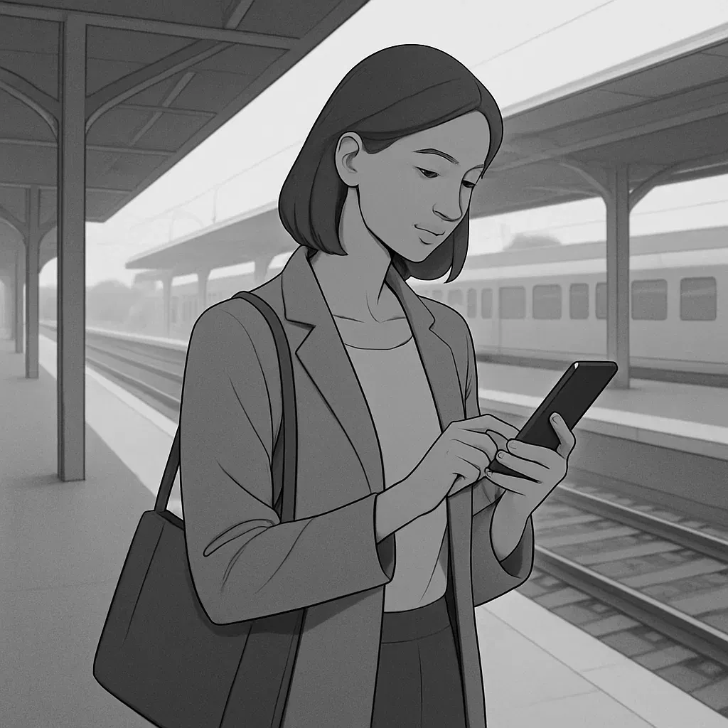 A woman in her mid-30s is standing on a railway station platform, using a smartphone.