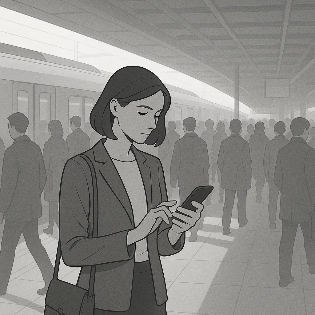 A woman in her mid-30s is standing on a railway station platform, using a smartphone. The platform is very busy as it’s the morning commute rush hour.