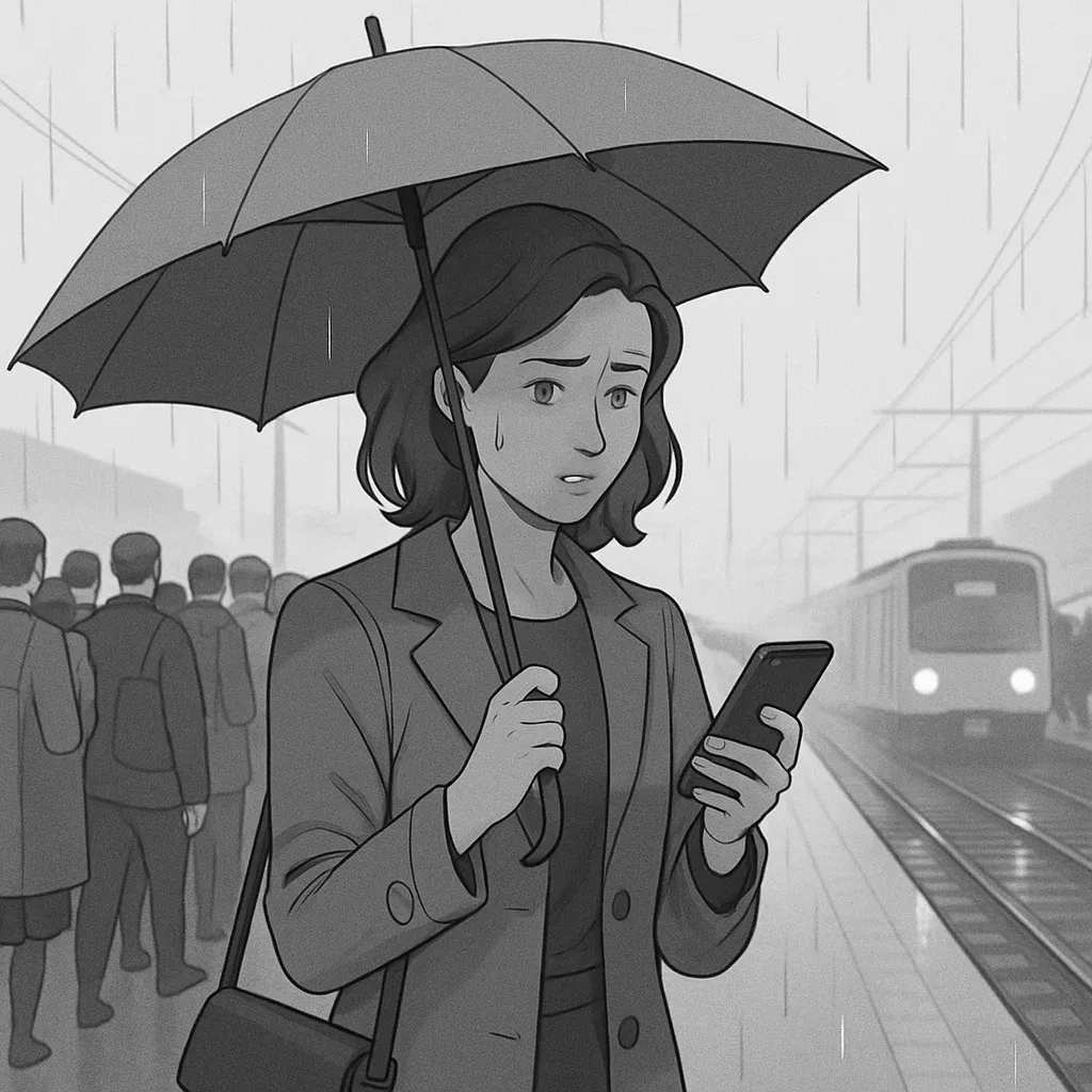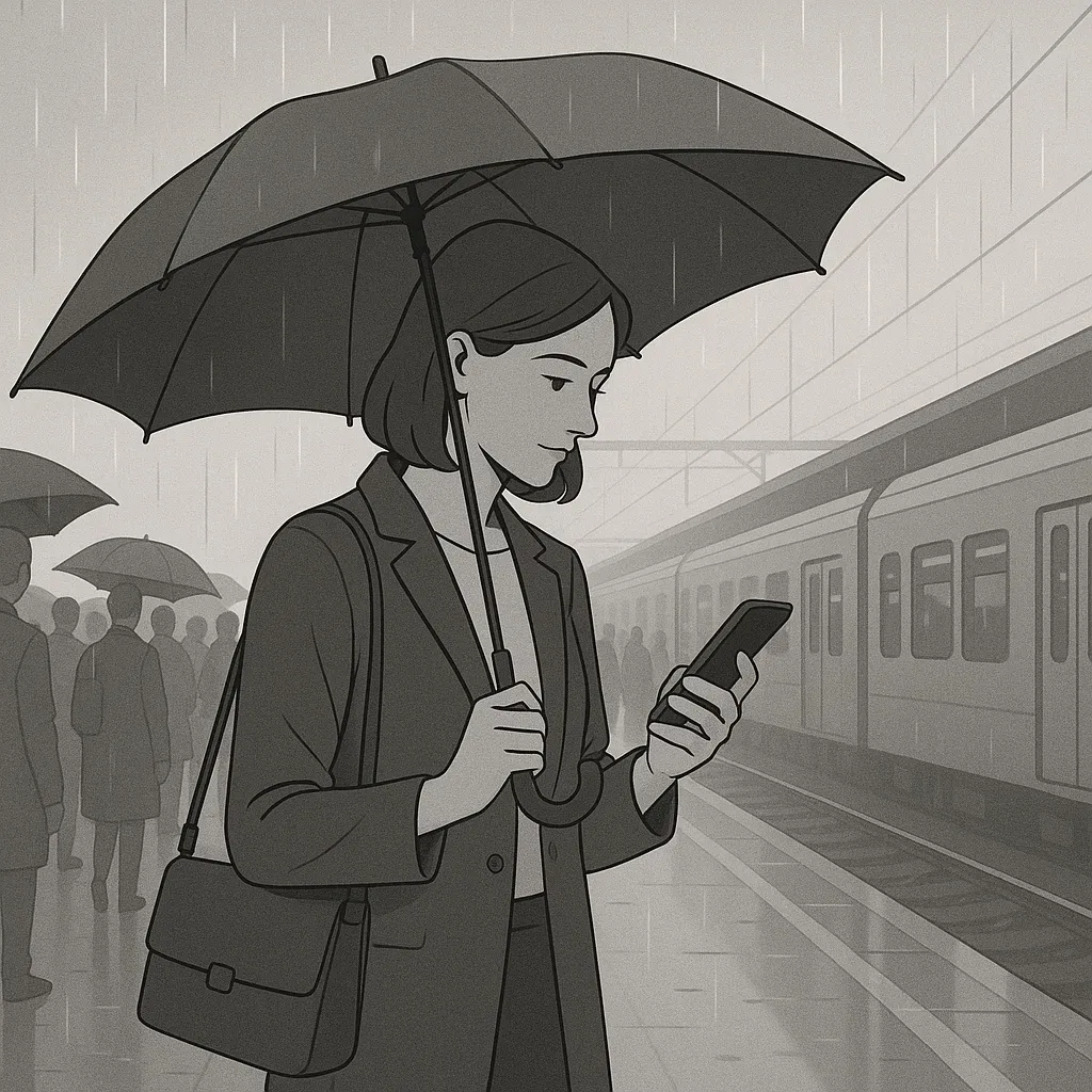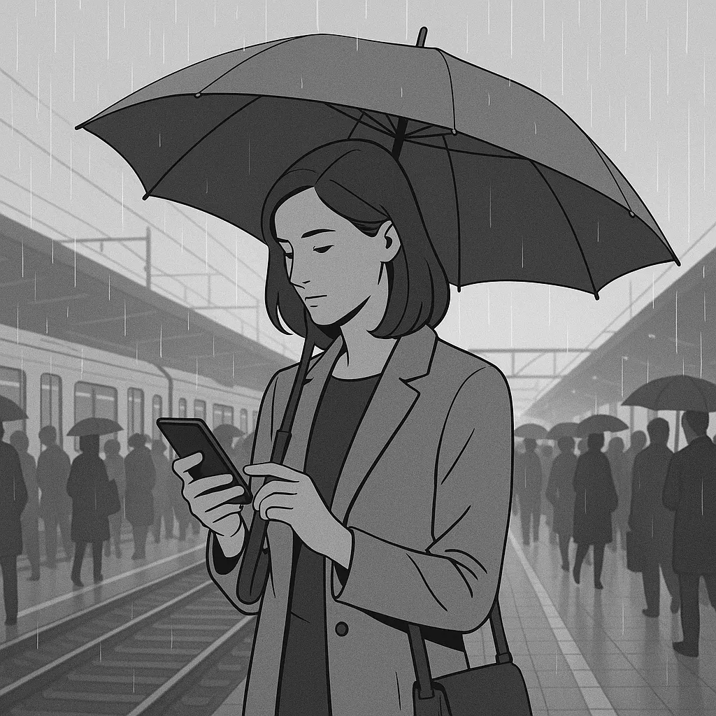 A woman in her mid-30s is standing on a railway station platform, using a smartphone. The platform is very busy as it’s the morning commute rush hour. It is raining. The platform has no roof, so she holds an umbrella with one hand and uses her phone with the other. She looks anxious (although not sad) as she needs to make sure she gets the next train.