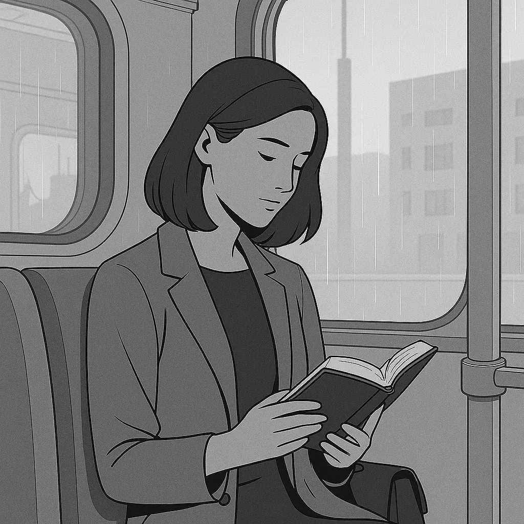 The same woman, but sat on the train that she was waiting for, reading a book.